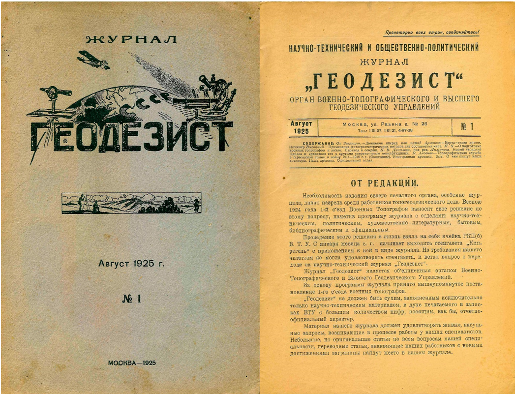 В августе 1925 года вышел первый номер журнала «Геодезист» - «об’единенный орган Военно-Топографического и Высшего Геодезического Управлений» как развитие выходившей с января 1925 г. стенгазеты «Кипрегель» с приложением к ней в виде одноименного журнала. На рис. 1 приведены обложка и первая страница этого журнала [43].